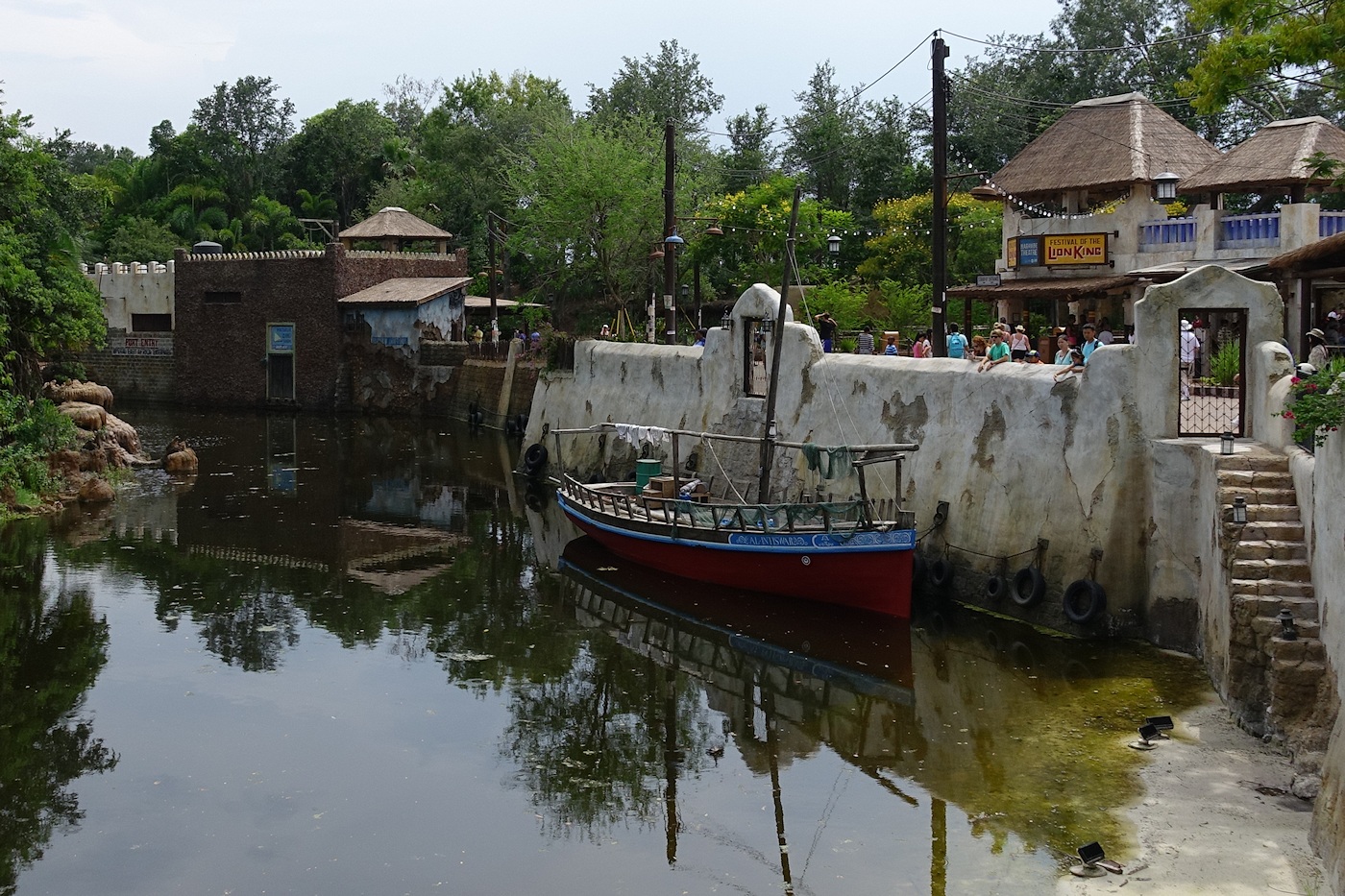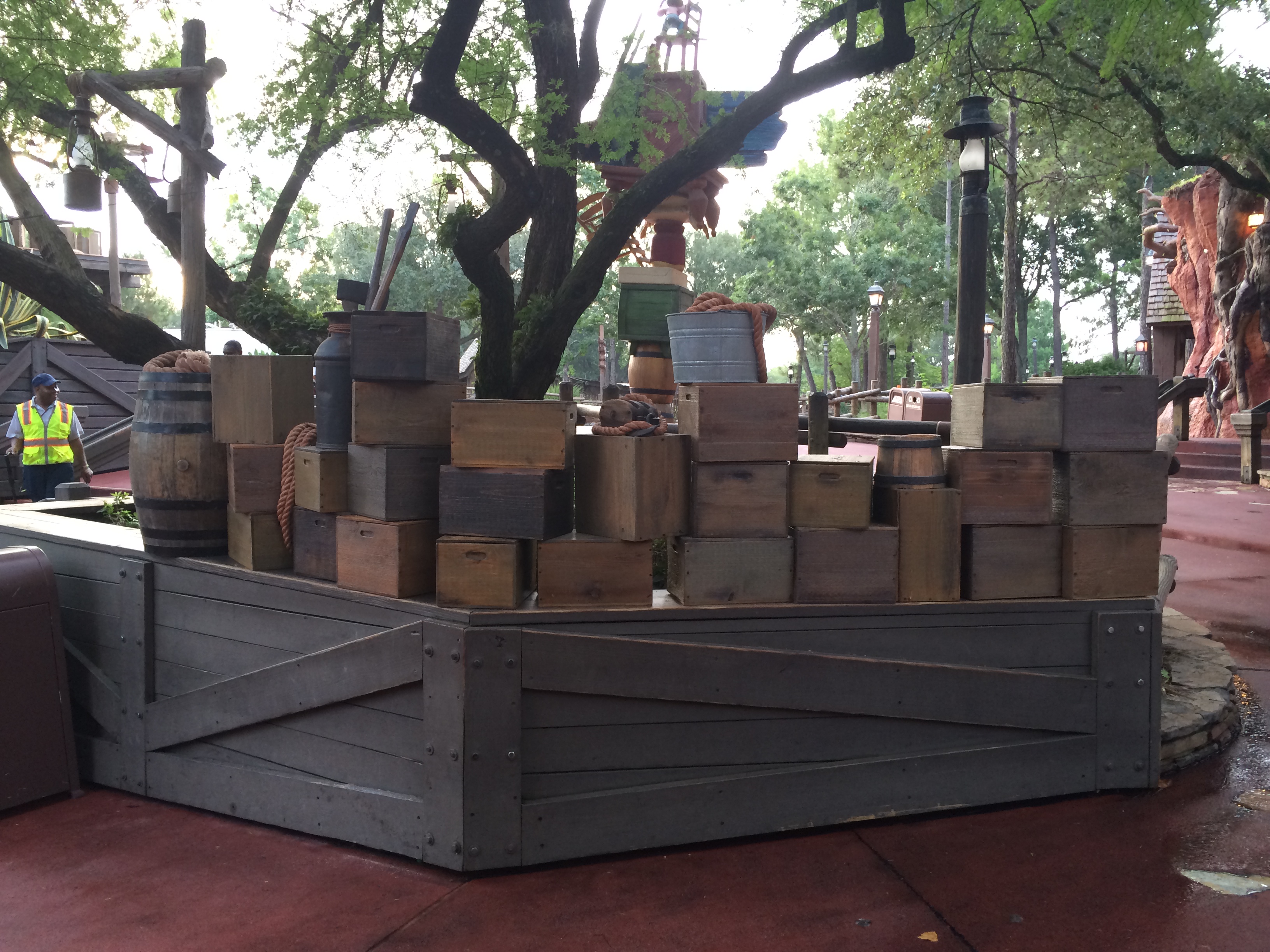 Installed crates, barrels, ropes and tools to prevent guests from sitting on this ledge waiting for Splash Mountain.