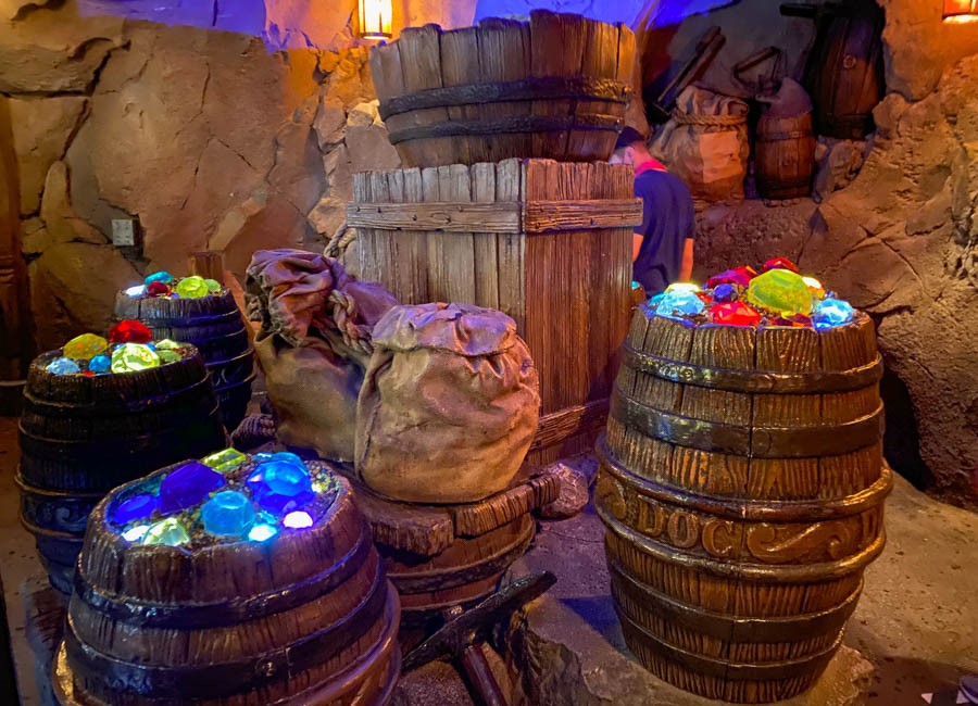 Installed prefabricated burlap bags, barrels, ropes and tools in the queue and ride path of Seven Dwarfs Mine Train at Magic Kingdom Park.